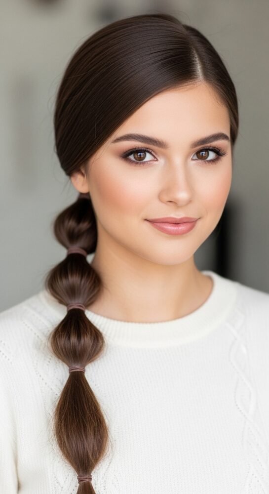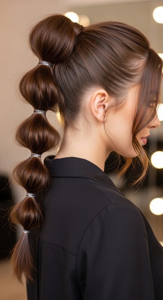 Tie your hair in a low ponytail, then add another elastic every three inches, but instead of “bubbling” the hair out, keep it sleek and straight.