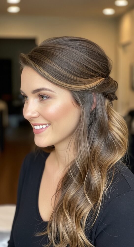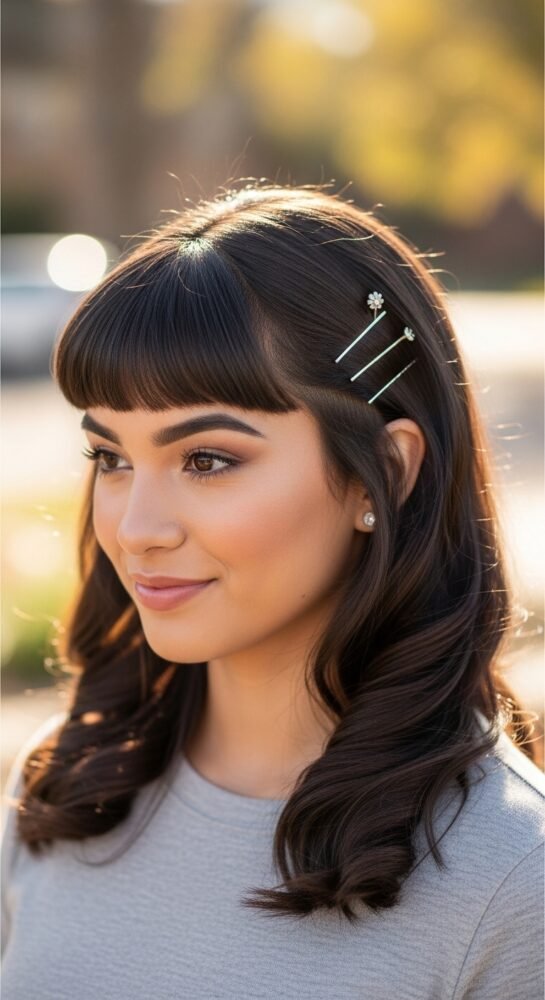 For a more “put-together” vibe, you can lightly curl the ends of your hair, but it looks just as good on sleek, straight strands. It’s a great way to keep flyaways at bay while adding a touch of elegance to a basic t-shirt and jeans combo.