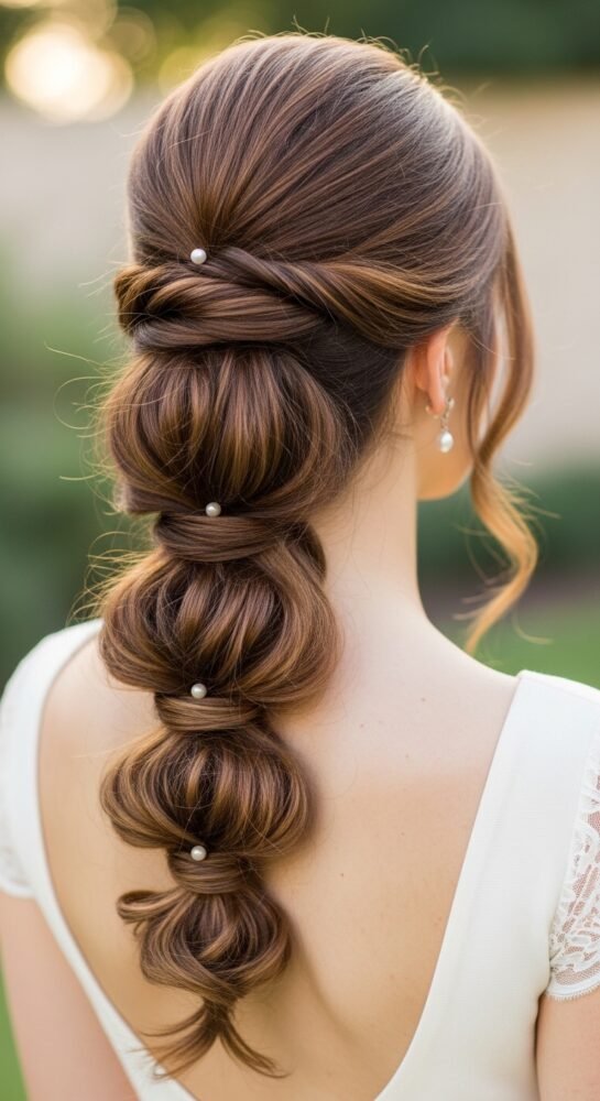 The bubble ponytail has taken social media by storm because it adds a high-fashion edge to a standard ponytail with almost no extra skill required. It works best on long hair, as you need enough length to create multiple “bubbles.”