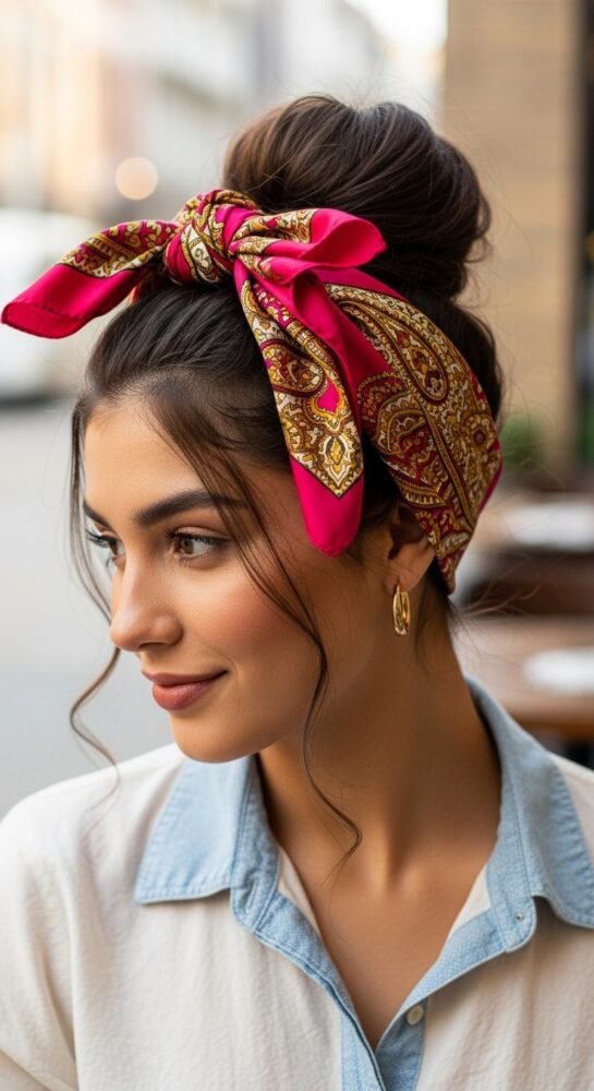 Simply tie your hair into a standard bun at whatever height you prefer. Take a colorful silk scarf, fold it into a narrow band, and wrap it around the base of the bun, tying it in a knot or a bow.