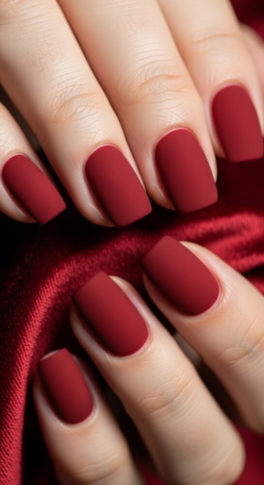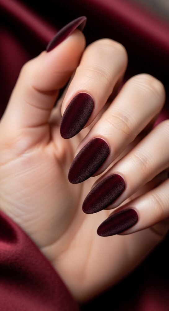 Velvet nails are a massive trend, and a dark cherry shade is one of the most luxurious seasonal nail ideas for the cooler months. This uses a magnetic polish that, when activated, creates a shimmering, multi-dimensional effect that looks exactly like crushed velvet fabric.