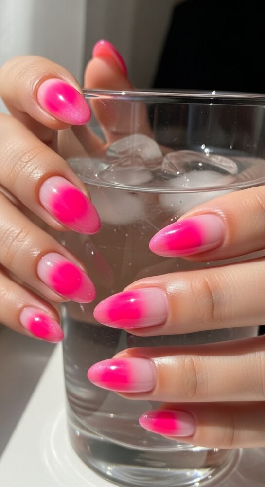 This involves a lighter pink base with a concentrated “glow” of hot pink in the center of the nail, created with an airbrush for a seamless transition.
