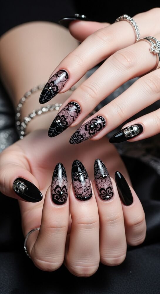 As October approaches, seasonal nail ideas often take a turn for the mysterious. Spooky chic black lace involves a sheer black “stocking” base with intricate, hand-painted lace or spiderweb patterns in opaque black.