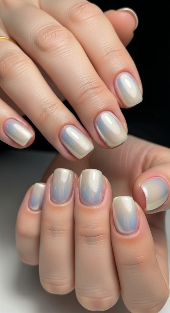 For a “clean winter” look, the chrome pearl is a standout among seasonal nail ideas. This involves a milky white base with a white-silver chrome powder rubbed over the top, creating a finish that looks like a real pearl or a smooth snowball.