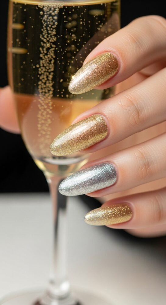For a New Year’s Eve vibe, the champagne sparkle gradient is a top-tier choice for seasonal nail ideas. It features a nude base that fades into a dense, multi-tonal gold and silver glitter at the tips.