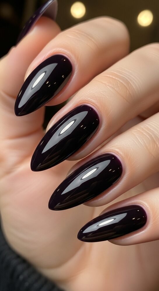 An almond or oval shape keeps this dark color looking feminine and soft. The finish is a “power-gloss” topcoat that gives the plum a mirror-like shine.