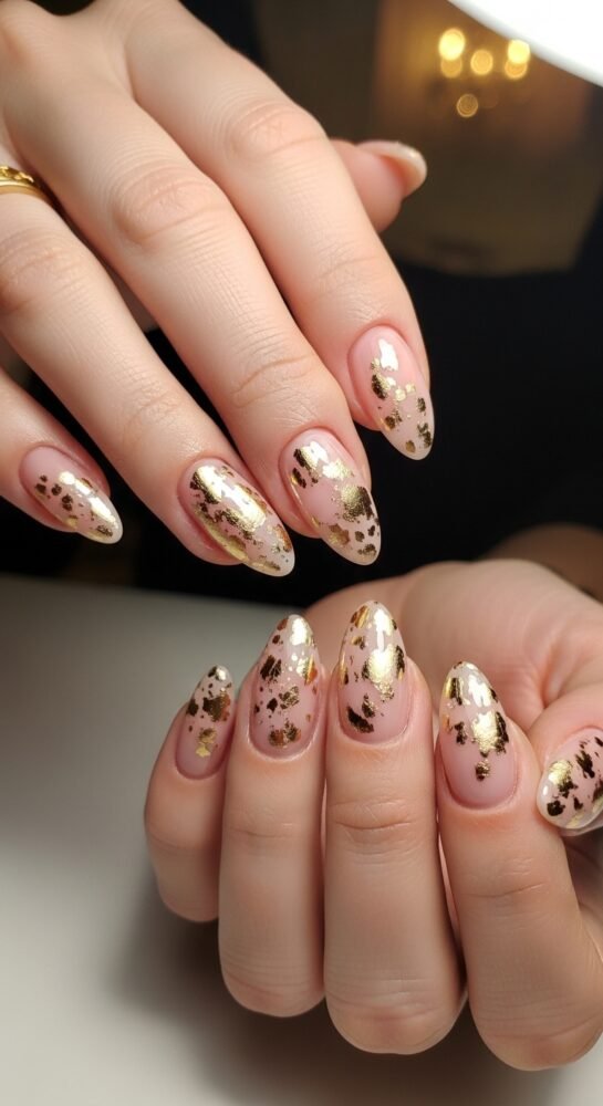 Incorporating gold foil is a wonderful way to elevate your nails for all seasons, but it feels particularly right in the fall. This design uses a deep forest green or navy base with “shattered” pieces of gold leaf applied randomly across the surface.