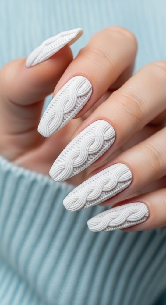 Texture is a key element of seasonal nail ideas, and the cable knit look is the ultimate winter “cozy” set. Using a thick 3D gel, the artist creates the pattern of a knitted sweater over a matte white or cream base.