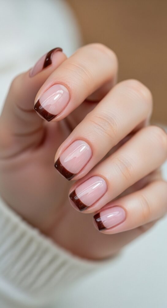 The “brown is the new black” trend is fully realized in this entry for seasonal nail ideas. A chocolate brown micro-French features an ultra-thin line of deep espresso brown at the very tip of a nude or tan seasonal nail ideas.