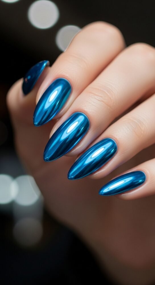 For those who prefer cool tones, electric blue chrome is a standout among summer seasonal nail ideas.