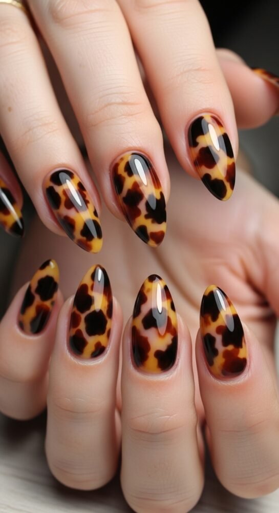 When the air turns crisp, seasonal nail ideas shift toward richer, moodier tones. The tortoiseshell design is a perennial favorite for autumn, featuring layers of translucent amber, deep brown, and black to create a mottled, glassy effect.