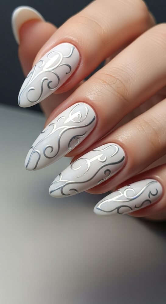 A short oval or almond shape is the best way to keep this look elegant and understated. The finish is a high-shine pearlescent chrome. This suits winter because it is white, bright, and reflects the “purity” of a winter morning.