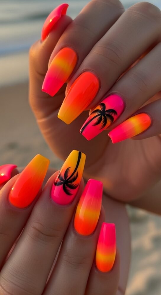 As we transition into the warmer months, seasonal nail ideas become bolder and more vibrant. The neon coral sunset look is a high-impact choice that features a bright coral base with a subtle orange-to-pink shimmer.