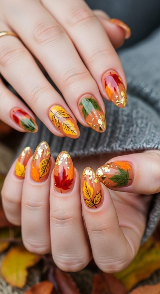 For a more literal interpretation of seasonal nail ideas, abstract fall leaves are a beautiful choice. Instead of a cartoonish leaf, this design uses “brushstroke” techniques to create the impression of leaves in shades of mustard, rust, and plum.