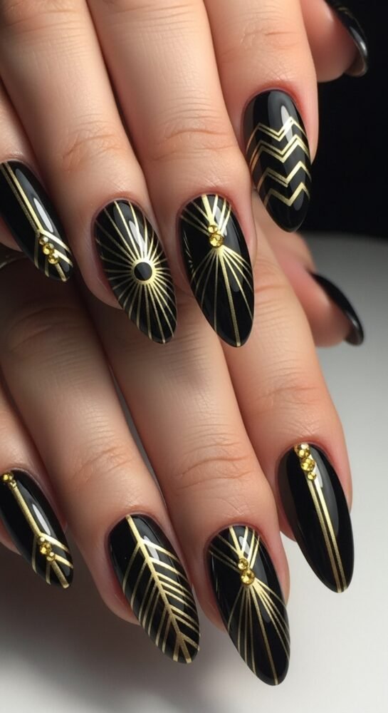 The winter season is often a time of formal events, and Art Deco-inspired seasonal nail ideas are perfect for such occasions. This design uses a solid black base with crisp, geometric gold lines, reminiscent of the “Great Gatsby” era.