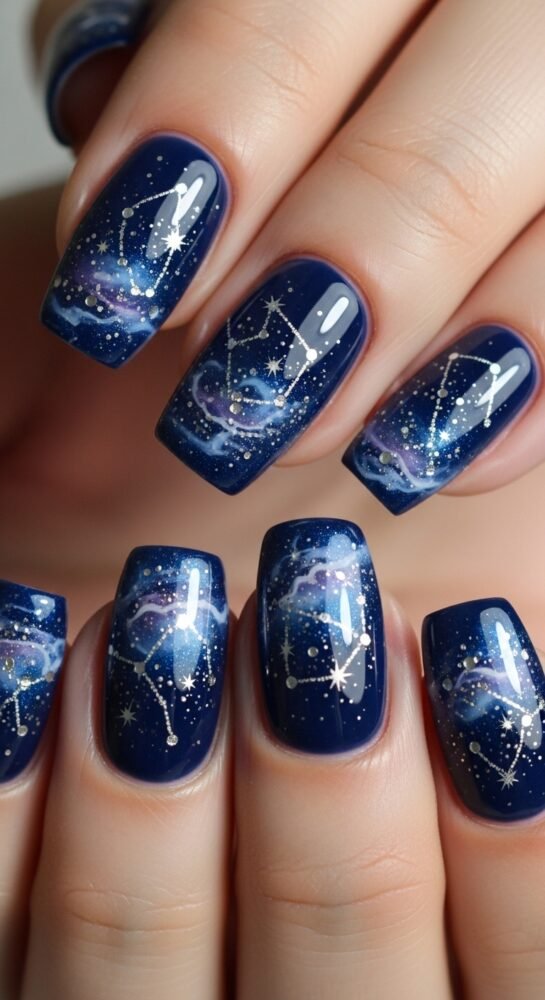 A short square or medium almond shape provides a clean canvas for this “galaxy” look. The finish is a high-gloss topcoat that gives the blue a “midnight” depth.