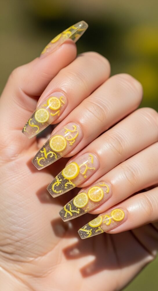 This look uses a translucent yellow “jelly” polish, often with small hand-painted lemon slices or citrus-themed decals embedded within the layers.