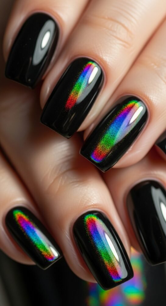 Closing out our list of seasonal nail ideas is the holographic midnight black. This is a solid black base infused with linear holographic pigments that create a “rainbow” flame when hit by light, resembling the Northern Lights.