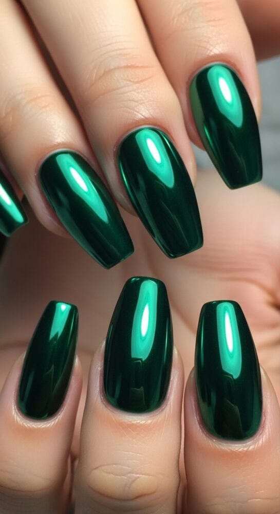 Emerald green is a powerful color, and as a choice for four seasons nail design, it provides a bridge between autumn and winter. This look uses a dark green base with a matching green chrome powder for a metallic, beetle-wing effect.