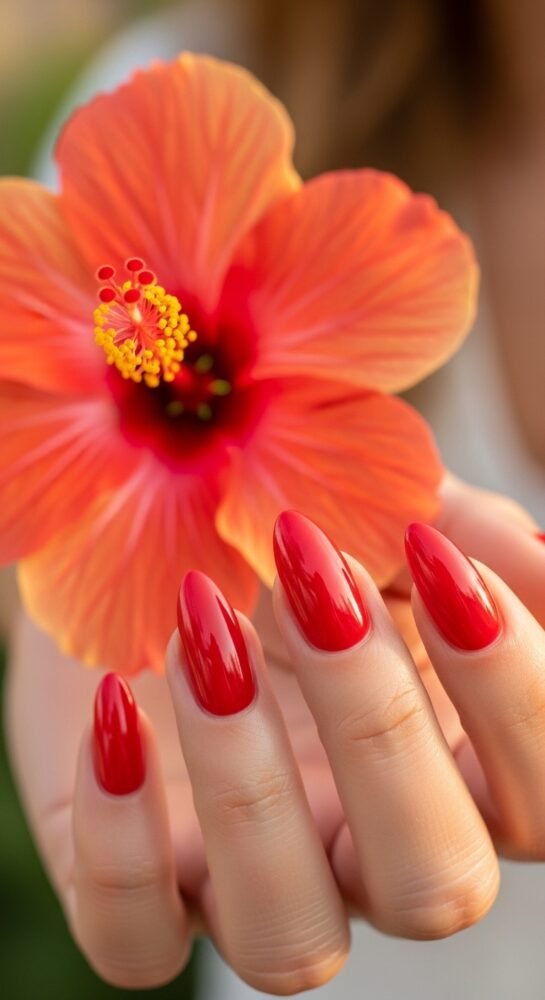 An almond or coffin shape is the most traditional and elegant choice for this festive look. The finish is a high-shine gloss that makes the red look “lit from within.”