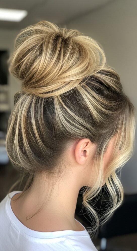 The high-volume messy bun is the ultimate “undone” chic look. It is most successful on medium to long hair that has a bit of natural wave or texture. Flip your hair upside down and gather it into a high ponytail.