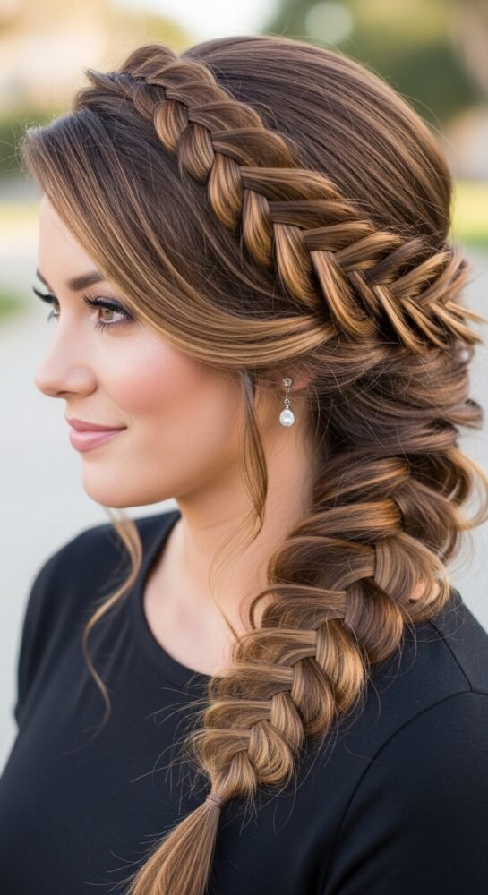 A side-swept braid offers a soft, feminine silhouette with zero technical difficulty. It is best suited for long hair, especially those with thick or wavy textures that hold a braid well.